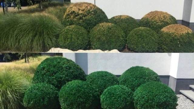 Fabian de la Croix (37) was bij een klant om een huis te witten met zijn verfspuit. De planten moesten daarbij natuurlijk niet geraakt worden. Daarom werd een doek over de buxussen gelegd. “Maar door de enorme droogte en felle zon waren de planten daarna helemaal verdord. Toen ben ik net zo lang gaan zoeken tot ik iets gevonden had waardoor de plant er weer netjes uit zou zien.” RTLZ
