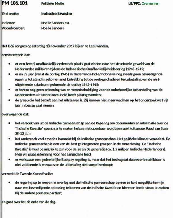 Dus in 2011 diende D66 bij monde van Pia Dijkstra een motie in om de Indische kwestie op de agenda te zetten .Motie werd kiele kiele afgewezen 75-73 Regering partijen waren tegen .Nu sekarang 2019 zit D66 zelf in de regering en wilt Pia Dijkstra niks meer van die motie weten ,ja ben je dan een soto ayam oftewel een soepkip of niet ? Deze mensen hebben geen moraal bij hun gaat het om macht en eigenlijk kan die hele Indische gemeenschap Pia Dijkstra geen moer schelen .Ok volgende verkiezingen ,D66 houdt 1 zetel over en vliegt uit het kabinet en wie heeft er weer de grootste mond over die Indische kwestie ? Juist ja Pia Dijkstra ! Tjonge jonge mw Dijkstra u en uw partij zijn inderdaad noch vlees noch vis ,jullie zwabberen maar wat ,ben bang dat jullie trouwe aanhang er ook zo over denkt ,dat wordt een zware afstraffing bij de volgende verkiezingen .Wie je wie er ECHTE RUGGEGRAAT heeft ? ………Noelle Sanders !!!