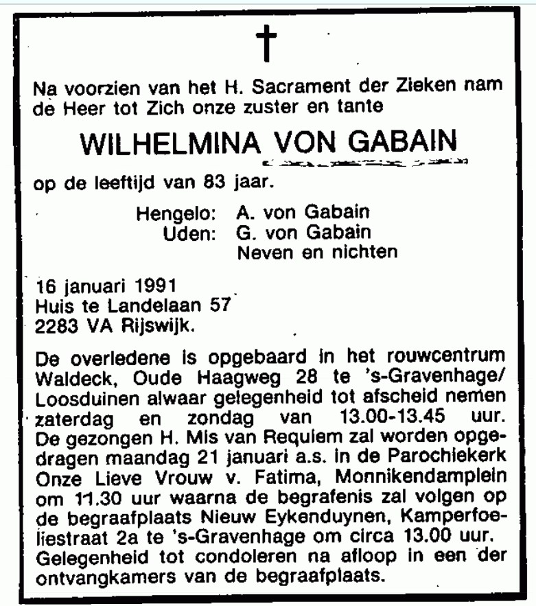 De familie von Gabain : In Duitse adellijke families is het voorzetsel VON iets wat het predicaat adel weergeeft .Claus von Amsberg is b.v van lage Duitse adel ,altijd mooi dat woordje von in je familienaam .Er zijn nogal wat adellijke Duitse mannen naar Indie gegaan en hebben daar een Inlandse vrouw ontmoet ,hun kinderen Indo,s dus hebben ook recht op de adellijke titel van Pa .De laagste Duitse titel is Freiherr te vergelijken met de Nederlandse titel Jonkheer .