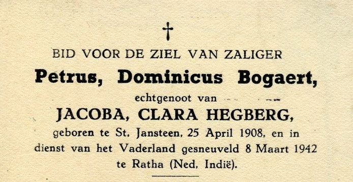 Wie kent er nabestaanden van Petrus Dominicus Bogaert? De in Sint Jansteen geboren Bogaert sneuvelde in de Tweede Wereldoorlog op Sulawesi. Luitenant-kolonel b.d. Jacq Brijl zoekt nabestaanden van Bogaert om hem postuum een onderscheiding te kunnen geven.  pzc.nl
