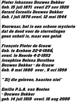 De broers Pieter en Gerard Douwes Dekker werden het eerst begraven. Zoons van Theodora Heijning en Engel Douwes Dekker, geboren 1842 in Beemster, Pieter DD was zijn vader en Multatuli was zijn oom. Engel was controleur Binnenlandsch Bestuur te Kedoe, directeur te Batavia Nederlandsch-Indische Levensverzekering- en Lijfrentemaatschappij, 1875-1891, gemachtigde voor Nederland Nillmij. Hij huwde in 1869 te Koedoes met Theodora Heijning, dochter van een chirurgijn en suikerplanter uit Bengalen. Engel en Theodora gingen definitief naar Nederland in 1891 met de vier kinderen, geboren te Java.