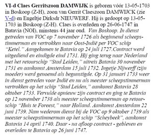 De stamouders Damwijk zijn een onbekende vrouw te Java en Claes Gerritsz Damwijk uit Boskoop. Hij arriveert in 1727 te Batavia en overlijdt daar in 1747 als meester scheepstimmerman ( zie dit fragment uit parenteel van Cornelis van Damwijck)