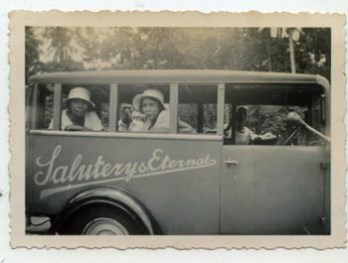 = Deze 2 personen in een auto(bus) waarop te lezen is “Saluterij & Eternal”