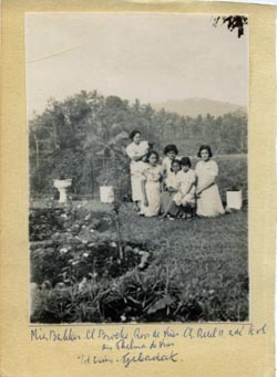 = In de Tjibadak tuin, Bantan west Java, met 6 personen en tekst o.a. Ch Retel H en Cl Broeke
