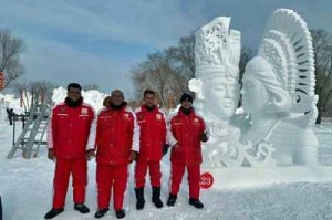 Members of the first team pose with their ice sculpture, themed “Bali Bride” at the 25th Harbin International Ice and Snow Sculpture Festival held in Harbin, China. (kompas.com/Courtesy of the first team) The Jakarta Post