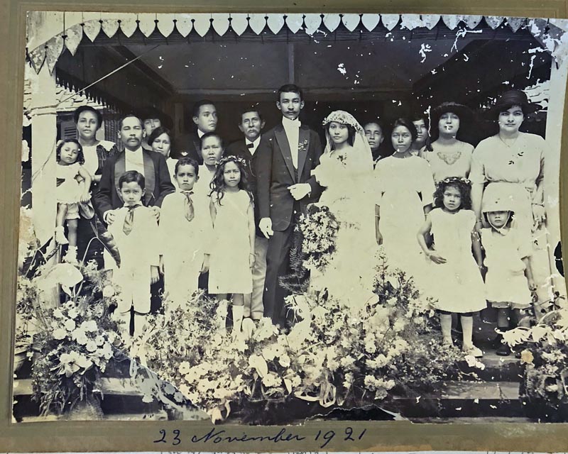 The photo was given to the current owner, a Canfijn, by his great aunt (Oma) Margaretha Broeksmit/van Dijck-Canfijn (twice married). It is believed that the Groom is Emile Victorius Leonardus Renon born 1898, Dec 25 in Tjilatjap. All the owner remembers is that a ‘Victor’ Renon, whom he met in Merauke (Dutch Nieuw Guinea) after the war, had married the daughter of his adopted ‘Oma.’ He seems to remember there were a couple of daughters but that their mother was no longer alive.