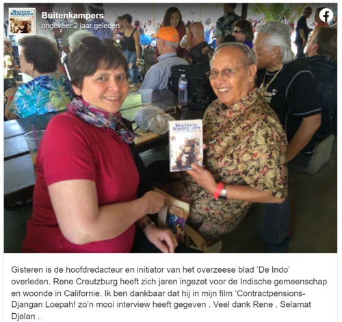 Hr Geenen,Ik heb net van Mevr Loekie Suparto gehoord dat onze vriend Rene Creutzburg, van daag door beroerte is gestorven Hier bij houd alles op met onze DE INDO tijsschrift. Mijn condoleances aan de familie.