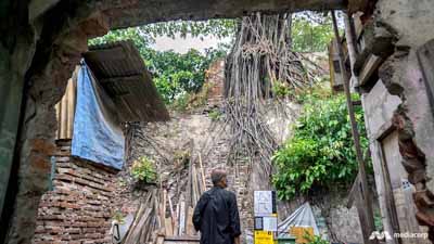 Archeoloog Candrian Attahiyat die zich voor één van de weinig overlevende secties van een 17de eeuws verdedigingsmuur in Jakarta, Indonesië bevindt. (Foto: Nivell Rayda) CNA