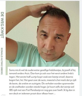 “De weg kwijt” door Ron Alting Siberg, Juist nu in coronatijd hebben we behoefte aan ontspanning, even weg van het OMT, de debatten, enge virussen en wattenstokjes in je neus. Ron heb ik leren kennen op “Indoweb” en later ook op andere Indo-fora, heb altijd al genoten van zijn ongezouten mening en vooral zijn heerlijke onvervalste Indo-humor, daarom was ik zeer benieuwd naar zijn debuutboek. In het autobiografische “De “Weg kwijt” verteld Ron over zijn leven in Indonesie, de aankomst in Holland, vrienden , familie, ervaringen en aanvaringen op school en werk. Niet alles ging van een leien dakje, het is hem zeker niet aan komen waaien, maar alles wordt met veel humor, knipogen en relativiteitszin beschreven. Zoals hij de vakanties, kumpulans en familiebijeenkomsten beschrijft is heel herkenbaar en vertrouwd. Wat als een rode draad door het boek loopt zijn zijn relaties. Het is ook een leuke gast hoor maar zoals zijn eigen moeder zegt:” Mijn zoon kan je beste vriend worden maar hij is niet geschikt voor een relatie”. Ron is wat je noemt een straigth-up guy, recht door zee, maar ook “recht voor z’n raap”, geen “gewone Indische jongen” maar een Indo pur sang.