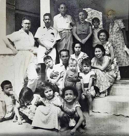 Op deze foto ook Wim (Willem Albert) de Graaf (links) en zijn vrouw An (Juliana) De Graaf-Blaset (zittend rechts op de trap naast mevrouw Houben). Achter tante An mijn oma Johanna Schenkhuizen- de Graaf en voor tante An (2 broertjes) Patrick en Wouter Schenkhuizen. Wouter is tijdens verlof in Nederland (Leeuwarden) geboren. Een verlof dat is doorgebracht in Hardegaryp en Velp. Daarna is het gezin Schenkhuizen met drie kinderen teruggegaan naar Makassar en begin jaren 50 is door mijn opa Ben (Anton Benjamin) Schenkhuizen de foto genomen. De meneer tussen oom Wim en meneer Houben is voor ons nog onbekend, maar voor meneer Houben (op de trap) zit oom Coen Muller en rechts naast meneer Houben staat tante Ietje Muller- Kraaijenbrink.