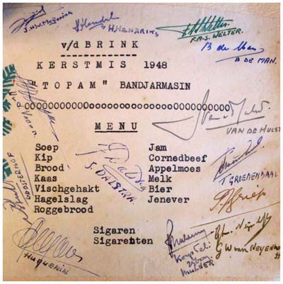 Een menu waarop alle aanwezigen hun naam en handtekening hebben gezet, ook John Meijerink, de jongeman van de brief “Kerstmis in de oeloeh”.