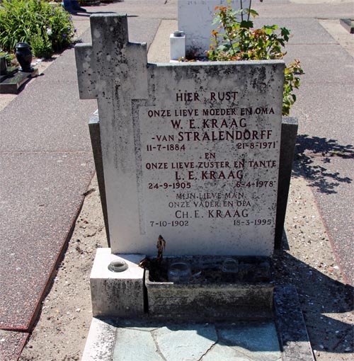 Hier ligt begraven Wilhelmina Eleonora van Stralendorff, geboren 1884 te Djokjakarta, overleden 1971 in Den Haag. Haar moeder was Anna Louise van Stenus geboren (1861), geleefd en overleden (1914) in Djokjakarta. Anna’s jong overleden grootvader († 1823) kwam uit Amsterdam. De vader van Wilhelmina was Johan Bernard van Stralendorff (1862 Djokjakarta-1919 Djokjakarta). Hij was magazijnchef van apotheek Gorkom & Co te Djokjakarta.