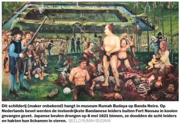 Ik heb dat schilderstukje nog even goed kunnen vergroten en hoopte dat het toch beter geschilderd was dan ik dacht ………………niet dus ! maar o.k slecht of niet het voldoet wel aan het doel van dat museum en dat is hun bezoekers in een oogopslag te laten zien waarom het gaat ,het uitmoorden van die bevolking op Lontor . Het is geen schilderij om in de kinderkamer op te hangen of boven de haard ( ?) Als dat museum hierdoor meer bezoekers krijgt ( Wat best zou kunnen ,want de naam Banda zingt nu rond vooral in verband met deze volkerenmoord ) is dat mooi meegenomen voor die huidige bevolking .overigens heeft Jan Slauerhoff al eerder in de jaren 30 v.d.v.e die wandaden van Jan Pieter C op schrift vastgesteld ,een toneelstuk van Slauerhoff over Coen werd door allerlei authoriteiten tegengehouden tot het eindelijk in 1986 werd opgevoerd ,bijna 50 jaar na de dood van Slauerhoff .