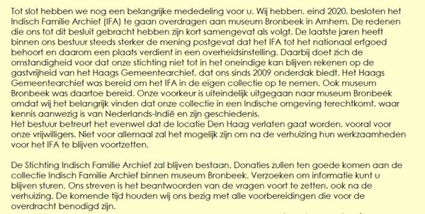 Het I.F.A. , verblijvend in het gemeentearchief van Den Haag en meer dan een jaar gesloten vanwege covid, verhuist het archief  naar Bronbeek.  Op de sites Facebook en Indisch Familie Archief staat dit nog niet vermeld.  Het is kenbaar gemaakt in een nieuwsbulletin gestuurd naar de donateurs.