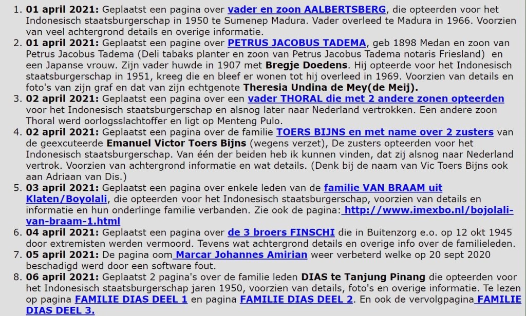 De updates betreffen veelal families die in de jaren 1950/1951 opteerden voor het Indonesisch staatsburgersschap en waarvan sommigen later spijtoptant werden en naar Nederland vertrokken en Nederland als tussenstaion gebruikten op zoek naar voorspoed en geluk.