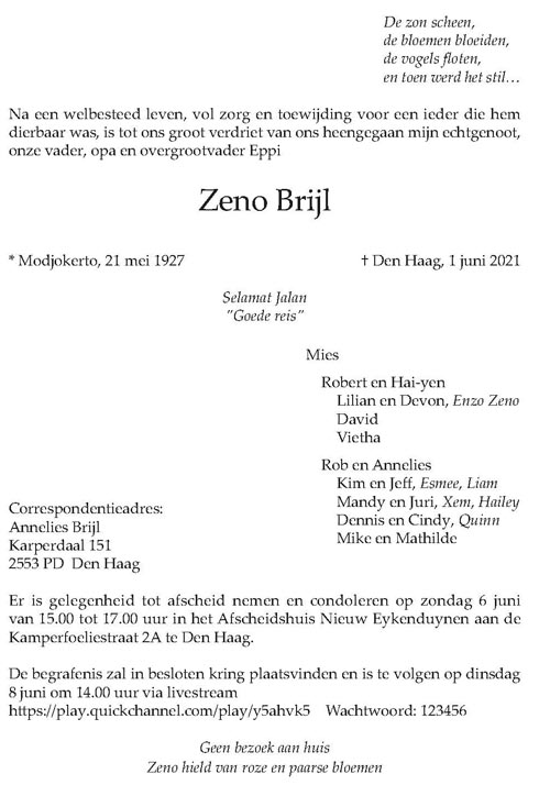 Voor zijn lieve echtgenote Mies, kinderen en kleinkinderen veel sterkte.