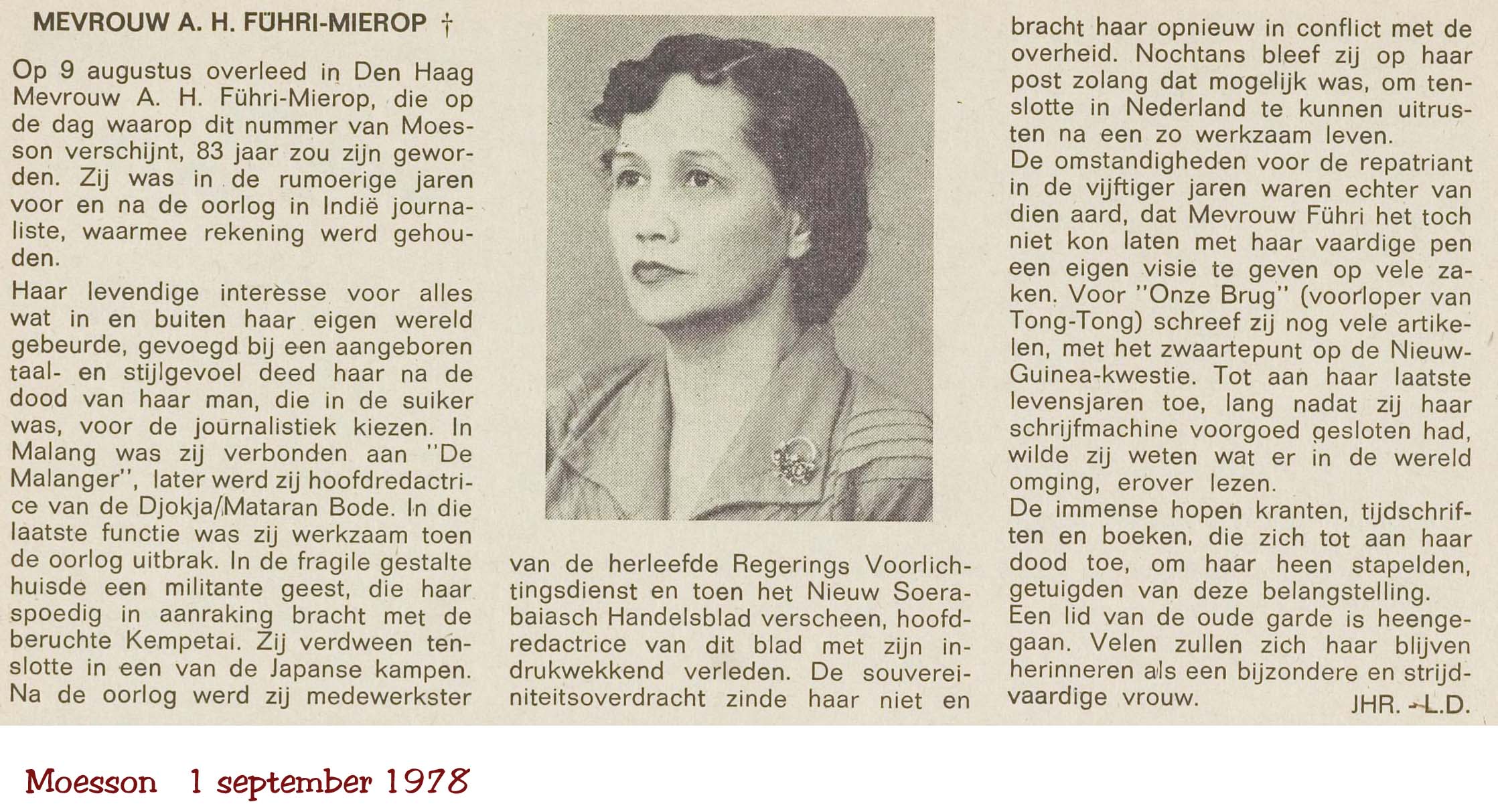 Tja dat was in 1951 in die Vrije Nieuwe Staat Indonesia .Maar als je nu in 2021 zo,n zelfde stuk schrijft over de huidige president van Indonesia en zijn Irian Barat politiek ,wordt je ook opgepakt zeker weten ! Het zelfde gebeurt er met je ( als kritische journalist in tal van andere landen : Rusland ,Wit Rusland ,Turkije ,China ,Noord-Korea,Venezuela,Tal van Arabische landen etc etc Maar in de jaren 50 v.d.v.e wemelde het van landen ,die het niet zo nauw namen met de persvrijheid ,ook in Nederland moest je oppassen niet te kritisch te zijn t.o Het Huis van Oranje ! en het Nederlandse optreden tijdens die politionele acties .Neemt niet weg dat Mw Fuhri – Mierop behalve een mooie vrouw ,ook een heel dappere vrouw was ! Zij was niet takut ! Denk als ik weer in Den Haag ben ,ik even een bloemetje bij haar graf neer ga leggen ,hulde aan deze bijzondere vrouw ! 👍😍👍