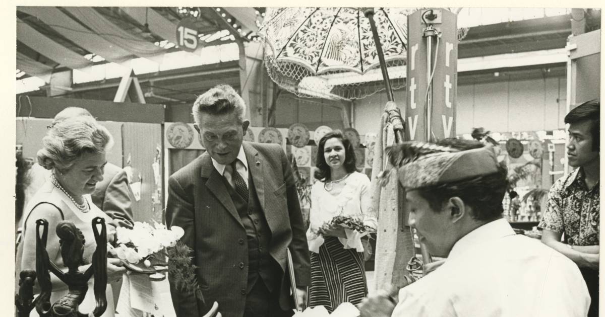 Burgemeester Vic Marijnen opent in 1973 de 15e Pasar Malam in de Houtrusthallen. Links zijn eega Miny Marijnen, op de achtergrond, met bloemstuk: Pasardirecteur Ellen Derksen, © Haags Gemeentearchief