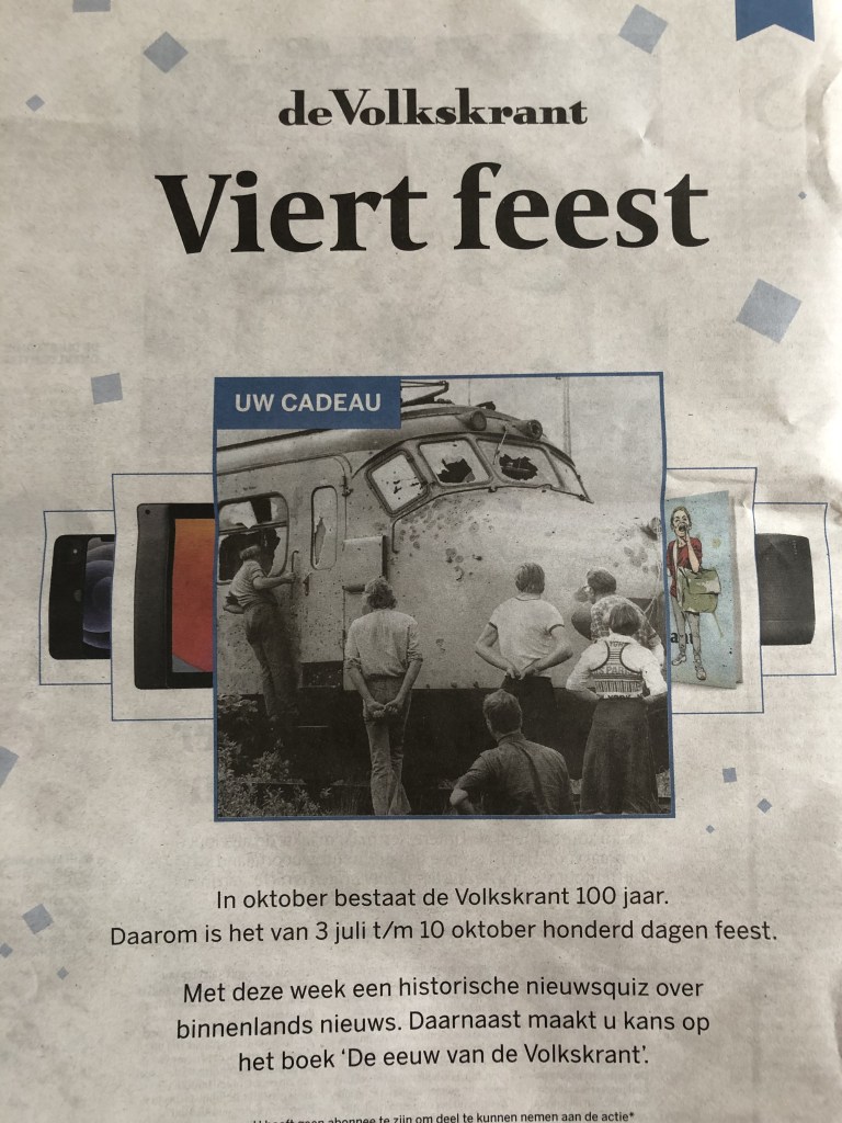 De volkskrant zette een advertentie ter viering van het 100-jarig bestaan.