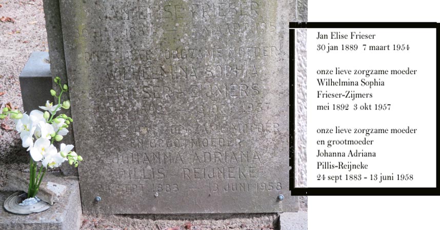 Als laatste werd Johanna Adriana Reijneke bijgelegd in dit graf in 1958. Door haar zoon en schoondochter Frieser, een nichtje van Jan Elise Frieser.