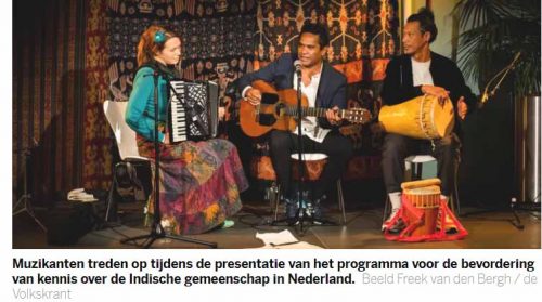 Muzikanten treden op tijdens de presentatie van het programma voor de bevordering van kennis over de Indische gemeenschap in Nederland . Indische Nederlanders: ze zijn met velen, maar niemand lijkt te weten met hoeveel precies. En ze hebben iets te maken met voormalig Nederlands-Indië, maar niemand lijkt te weten wát precies. Het zijn allemaal redenen voor het kabinet om een ‘collectieve erkenning van de Indische gemeenschap in Nederland’ te organiseren De Volkskrant