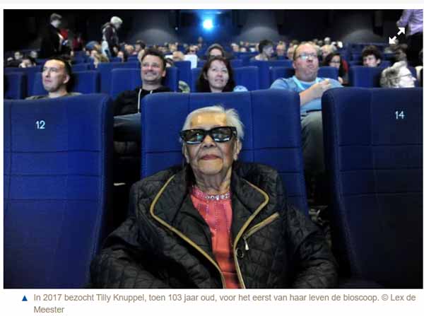 Tilly Knuppel-Heuvelink, de oudste inwoner van Vlissingen, is afgelopen week op 107-jarige leeftijd overleden. Dat heeft haar familie bekendgemaakt. In 2017 kwam zij in het nieuws, omdat ze toen – 103 jaar oud – voor het eerst in haar leven naar de bioscoop ging. Zij bekeek tijdens Film by the Sea Wonders of the sea, een 3D-film over het onderwaterleven. ,,Het was geweldig!”, zei ze, direct na afloop. ,,Ik heb er echt van genoten.”pzc.nl