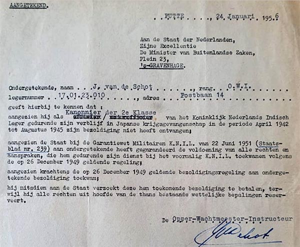 In 1956 stuurde kniller J van de Schot een brief naar de minister van defensie en verzocht uitbetaling van zijn salaris over de periode van Japanse krijgsgevangenschap.