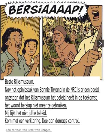 Dit door niet duidelijk te vermelden dat het woord bersiap wel gebruikt wordt in de expositie. En samen met zijn verwijt van racisme de indruk maakt dat het hele woord en wat er gebeurde niet behandeld zou worden op de expositie.