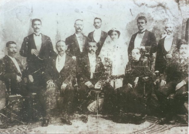 De tweede zittend van links is Charles Lapre, half broer van de bruid.