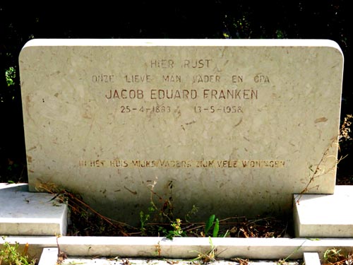 Dit is de grafsteen van Jacob Eduard Franken, geboren in 1883 te Sintang en overleden 1958 in Den Haag. Zoon van Mina en Geerlig Franken ( 1855 Brummen- 1929 Den Haag), die als soldaat in 1878 te Indië arriveerde. Geerlig klom op tot luitenant en pensioneerde in 1917 als Majoor magazijnmeester der Genie.