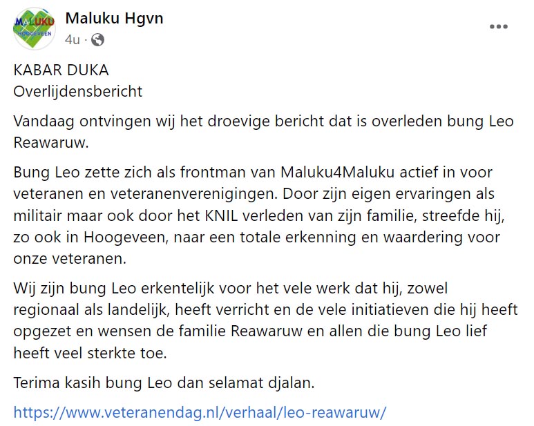 De pas overleden Molukse actievoerder Leo Reawaruw heeft veel gedaan voor zijn eigen mensen, met name voor de oudere generatie KNILlers. Het staat ook buiten kijf dat velen van deze mannen zeer slecht door de Nederlandse regering toen, en zeker nog tot 2017, slecht zijn behandeld. Voor de objectiviteit moeten er wel enkele feiten genoemd worden – die overigens weinig afdoen aan Reawaruws inzet.