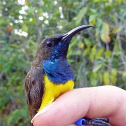 ***NOS: Niewe vogelsoorten ontdekt . Een van die nieuwe soorten, genaamd Wakatobi-honingzuiger, is herkenbaar aan zijn blauw-gele borst en relatief korte vleugels.