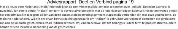 quote: ‘kiest de commissie niet te spreken over Indisch’… ‘omdat Indisch een term is die vooral verbonden is met de koloniale periode ‘Als je meer informatie wil geven over die koloniale periode dan moet je ook die term Indisch gebruiken… Deze verbondenheid is juist reden de term wel te gebruiken.En uitleggen dat het voor 1 of 1,5 miljoen Nederlanders een groepsnaam, naam van herkomst en culture identiteit is Dat hoort bij hun familiegeschiedenis.
