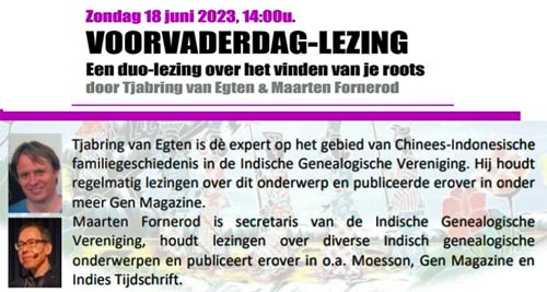 ‘Hoe onderzoek ik mijn Chinees-Indonesische Roots?’ Tjabring van Egten en Maarten Fornerod geven het antwoord op deze vraag op zondag 18 juni in de Agora te Voorburg. Op Vaderdag 2023 houden ze een toepasselijke ‘Voorvaderdag duolezing’.Veel Nederlanders hebben een Chinese voorouder uit Oost-Indië, Nederlands-Indië of Indonesië. Dit geldt zowel voor de Chinees-Indonesische gemeenschap als voor Indo-Europeanen.