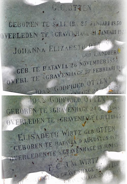 Elisabeth Otten, (1879 Batavia -1963 Den Haag) ook kind van Gerrit en Johanna. Zij en echtgenoot Frederik Carel Joseph Marie Wirtz (1883 Den Haag- 1866 Den Haag), werktuigkundig ingenieur waren de laatsten begraven in dit graf. Frederik was zoon van de pianist en muziekonderwijzer Carel Wilhelm Lodewijk Wirtz( 1841-1935 Breda) en Maria Adriana Paulez (1852-1937 Breda). Beiden geboren en gehuwd in Den Haag.