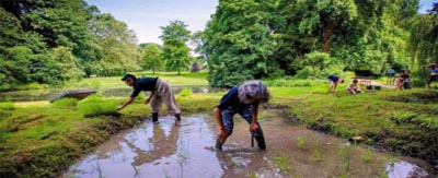 Bij het Indisch Monument in park Sacré-Coeur aan de Velperweg (naast Regina Pacis) staan op de jaarlijkse rijstplantdag zaterdag 22 juli vrijwilligers van stichting Sawah Belanda klaar om honderden rijstplantjes in de vijvers van de sawah’s te planten. Arnhemse Koerier