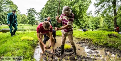 Blootvoets of met rubberlaarzen ploegen zo’n vijftien vrijwilligers van Stichting Sawah Belanda door de natte rijstvelden, sawa’s in het Indonesisch. De velden liggen in park Sacré Coeur, verscholen achter verpleeghuis Regina Pacis aan de Velperweg.