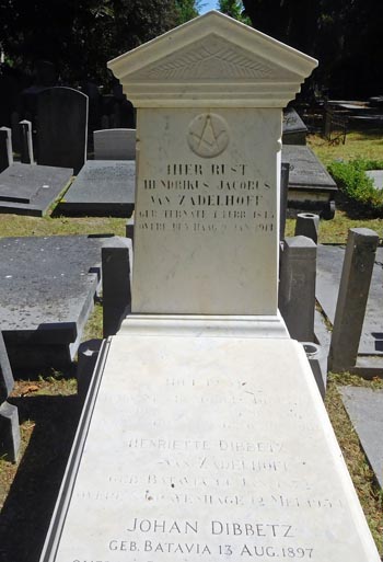 Dit graf werd gemaakt voor Hendrikus Jacobus van Zadelhoff en hij kreeg een symbool van de vrijmetselarij op zijn zerk. Hij was geboren in 1845 te Ternate en overleed 1914 in Den Haag. Zoon van Anna Frederica Wilhelmina van Huet Chevalier (1823 Maastricht-1896 Madioen) en Cornelis Hendricus van Zadelhoff (1812 Werkendam-1865 Cheribon), als luitenant der sappeurs in 1837 te Java gearriveerd, vanaf 1846 burger in ambtelijke functies.
