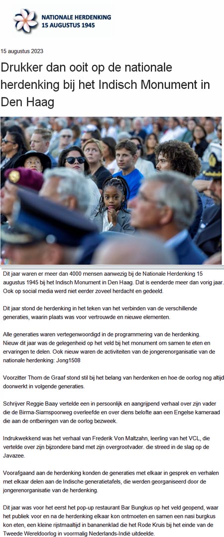 Jaren geleden in 2018, was er een dominee die ook de Indieherdenking in de kerk bracht (Ichtuskerk, Prot. Chr. Zoetermeer). Op twee grote schermen werd in de middag het tv programma gebracht. Er was een man van Pelita uitgenodigd. Er was koffie en cake. Maar de enige “gelovige” die kwam… was ik (katholiek van huis uit). Het was een klein praatgroepje met twee Indo’s (ik en de Pelita man).