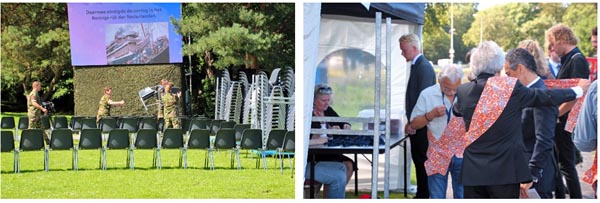 Vorig jaar werd de gezelligheid voor en na de plechtigheid door velen gemist. Dat is dit jaar heel mooi opgelost. Men kon v.t.v. nasi bungkus bestellen om voor- of achteraf te nuttigen. Er stond een mooie grote tent met tafels en stoelen en niet alleen de bungkus van Poetri Ayoe kon worden opgehaald, men kon bij hun ook saté kopen, Julia was aanwezig met lekkere hapjes en verse tjendol en voor de drankjes stond er een bar van museum Sophiahof.