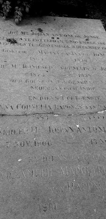 Hier ligt begraven Bonifacius Cornelis de Jonge. Hij was in 1917/1918 minister van oorlog en  1931-1936 gouverneur-generaal van Indië . Hij  ontving daar tweemaal NSB-leider Anton Mussert. Wat omstreden was. Geboren te Den Haag in 1875, overleden 1958 in Zeist. Gehuwd in 1904 met Anna Cornelia van Wassenaar (1883 Den Haag -1959 Zeist). Anna werd na hem in dit graf gelegd. Maar eerder werd begraven een broer en zus van Bonifacius.