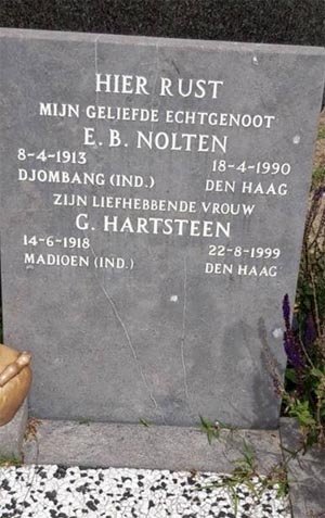 Dit is het graf van Eduard Benjamin Nolten en Georgine Hartsteen. Eduard was geboren in 1913 te Djombang en overleed 1990 te Den Haag. Zoon van Johanna Christina Dooms (1872 Ngawi – 1956 Udenhout) en Eduard Nolten (1865 Soerakarta-1913 Sitoebondo) klerk op diverse gouvernementskantoren.