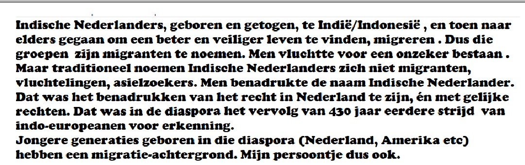 De wortels van mijn Indo-Europese familie kunnen minstens tot 1800 herleid worden. Mijn vader was geboren in Batavia (1925), groeide op in Nederlands-Indie en “repatrieerde” met zijn gezin in 1955 van Jakarta naar Nederland. Een doelbewuste keuze, dat niets met vluchtelingschap te maken heeft. Zowel hij als zijn gehele familie beschouwden zich nooit als Migranten. Op de vraag of wij Migranten waren, was het standaardantwoord: “wij zijn toch Nederlanders?”., zie ook reactie van M. Lazar.