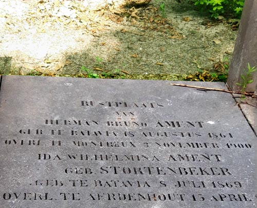 Hier ligt Herman Bruno Ament (1864 Batavia – 1900 Montreux) zoon van Celine Marguerite Bik (1846-1917) en Hendrikus Michiel Ament (1838 Buitenzorg-1911 Batavia), beheerder Aments suikerfabrieken en de landerijen Tjiboeboer en Pambilangan. Hendrikus was een zoon van Dina Cornelia van Riemsdijk . Herman Bruno was boekhouder van N.V. Ament’s Suikerfabrieken. In 1894 te Meester Cornelis huwde hij met