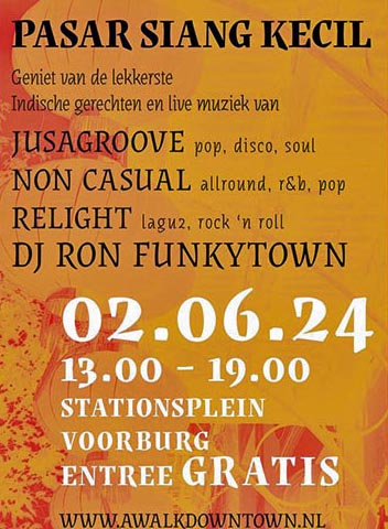 Dit evenement gaat van 13 uur tot 19 uur plaatsvinden op het Stationsplein in Voorburg en is gratis toegankelijk. Er is Indisch eten van o.a. restaurant Poetri Ajoe en er kan gedanst worden op live muziek van drie bands met Indische roots, die ook bij het evenement op het Malieveld op zouden treden.