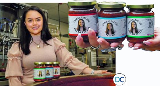 Zelf sambal maken. Shirley de Bruyn (23) begon er drie jaar geleden mee, voor de fun in de keuken van haar ouderlijk huis aan de Waterman. De passie voor sambal was er altijd al, maar door corona had ze ineens de tijd om zich echt te verdiepen in de wereld van verse pepers, te experimenteren en vooral veel te proeven. Haar avonturen zette ze online onder de naam Sambalmeisje. En met succes. Sambalmeisje is uitgegroeid tot een professionele onderneming met ruim 150 verkooppunten verspreid over heel Nederland, ook al een paar in België en een goedlopende webshop.(Foto’s: Stolk Fotografie)