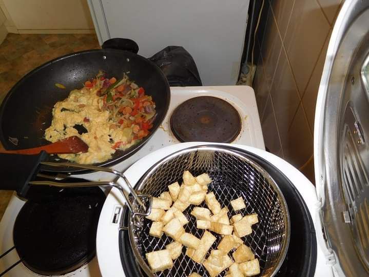 Wat zit er in die airfryer ? Tahu ,Tempeh of kentang goreng ? Kan het niet zo goed van die foto afleiden .Kentang goreng pedas / pedis bereid ik veel ,aardappeltjes in stukjes snijden ,frituren en dan met uien en sambal bakken .Ook te gebruiken als broodbeleg samen met gebakken eieren ,is eens wat anders dan brood met pindakaas ! Net als een broodje met sardientjes ,ketimun ( komkommer ) en sambal .De beste sambal koop je toch echt bij die Hindoestaanse toko .