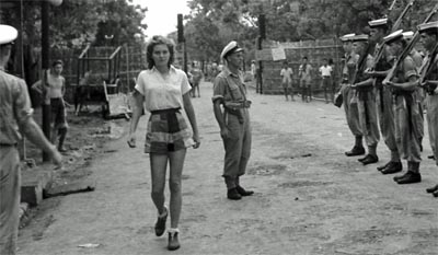 Dan die militairen bij de poort van het kamp. Ze lijken een zootje ongeregeld, in haast opgesteld, want niet naar grootte. Erewacht voor mooie Lily die net voorbijkwam, aflossing van de wacht bij de poort? Erewacht onwaarschijnlijk, want heweer aan de schouder en niet “gepresenteerd”. Wat voor eenheid stond daar? Aan het hoofddeksel van de groep militairen te zien, mogelijk Brits marinepersoneel. Wat doet die commandant vóór de troep in afwijkend (KNIL?) uniform er dan? Het was een rommeltje in die dagen na de Japanse capitulatie, ook in militaire zin. Maar toch aardig voor de krijgskundigen onder de lezertjes om het plaatje nader te duiden.