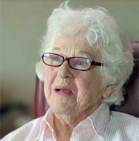 Zie het filmpje op deze NOS-pagina. Met meer foto’s van haar en ze zegt dan iets, wat lijkt dat ze zelf die lapjesbroek had gemaakt .