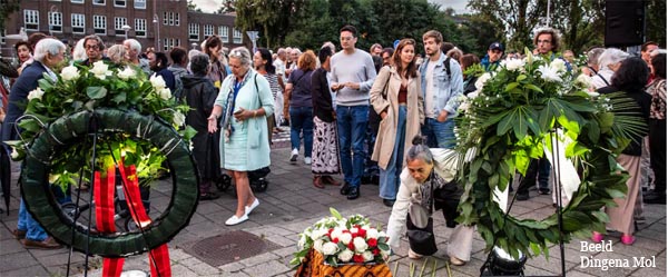 Amsterdam, Apollolaan: honderdvijftig mensen waren vrijdagavond bij de ‘alternatieve’ dekoloniale herdenking.